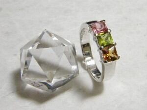 3色のトルマリンを使用したオリジナル・デザインによるシルバー・リングです。長期間変色しにくいようシルバー部分はロジウム・プレーティングしてあります。原石産地はブラジル、リングは国内制作です。ルースサイズは約4x4mm。